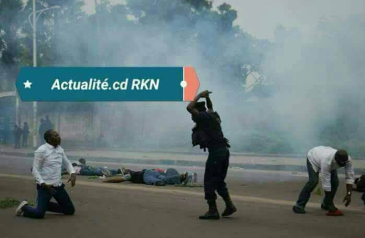 Kinshasa, avenue de la Libération, commune de Lingwala, le 21 janvier 2018. Mike Mukebayi, genoux à terre, fait courageusement face à un policier qui s’apprête à lui asséner un coup de matraque.