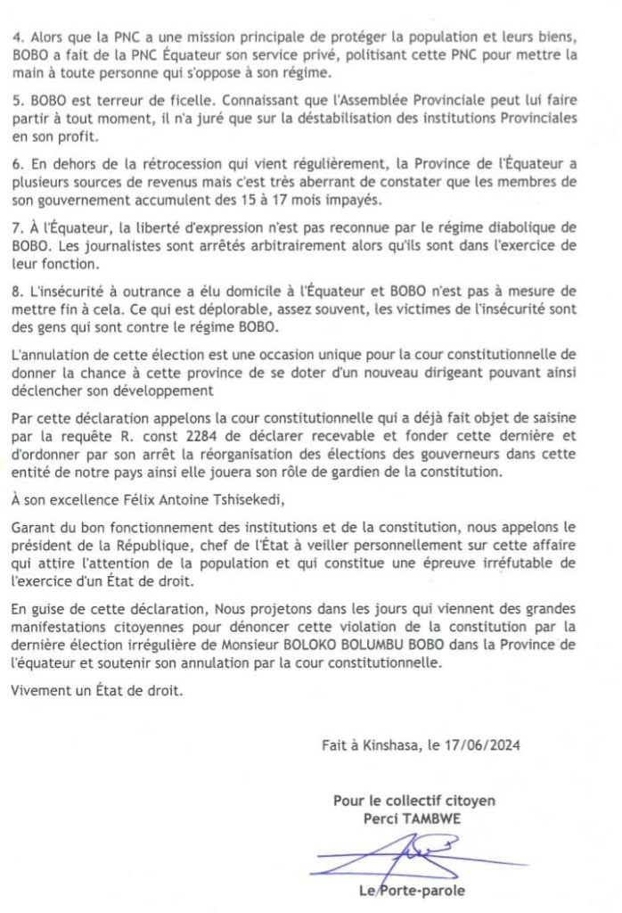 En outre, le collectif reproche au gouverneur Boloko Bolumbu Bobo une série des méfaits allégués, dont, selon lui, le détournement de 80% des recettes publiques de la province générées par la Direction générale des recettes de l’Equateur (DGRE) ; la spoliation des espaces publics ; la politisation du Conseil provincial de la jeunesse afin de semer la division entre les jeunes ; l’utilisation de la police comme moyen de répression contre ses opposants. Le collectif dénonce également le fait que les ministres provinciaux accusent entre 15 et 17 mois d’arriérés de salaires.