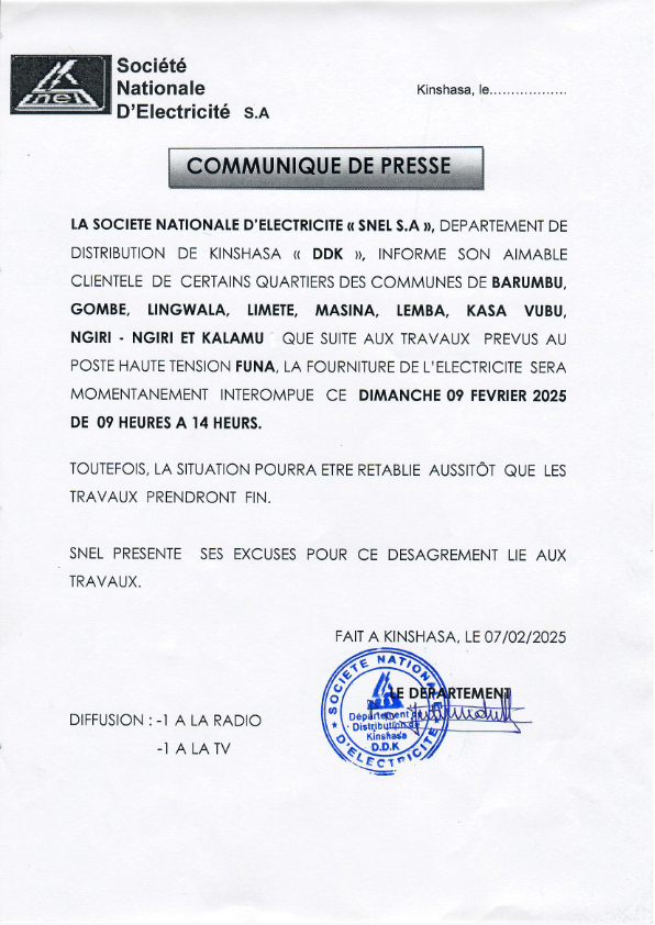 SOCIETE COMMUNIQUE DE LA SNEL DU 7 FEVRIER 2025 RELATIF AUX TRAVAUX AU... SOCIETEUncategorized COMMUNIQUE DE LA SNEL DU 7 FEVRIER 2025 RELATIF AUX TRAVAUX AU POSTE HAUTE TENSION DE FUNA February 8, 2025 Modified date: February 8, 2025 FacebookTwitterPinterestWhatsApp