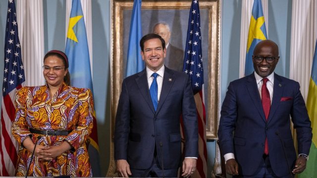 Thérèse Kayikwamba Wagner, à gauche, Marco Rubio, au centre, et Olivier Nduhungirehe à Washington, DC, le 25 avril. |Photo : Jim Watson/AFP/Getty Images