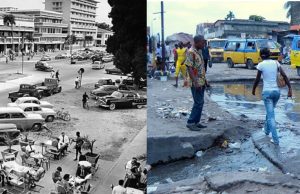 A gauche, une vue de Léopoldville, la belle capitale moderne léguée par la colonisation belge. A droite, Kinshasa d'aujourd'hui, 64 ans après l'indépendance :...