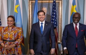 Thérèse Kayikwamba Wagner, à gauche, Marco Rubio, au centre, et Olivier Nduhungirehe à Washington, DC, le 25 avril. |Photo : Jim Watson/AFP/Getty Images